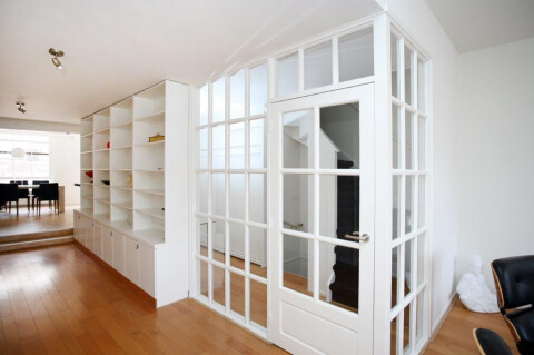 Via een klassieke entree op de begane grond komt u op de eerste verdieping. De hal op de eerste verdieping is licht door de kleine ramen naar de woonkamer. In deze hal vind u o.a. 2 grote inbouwkasten en een ruime toilet en de garderobe. Bij binnenkomst van de L-vormige woonkamer (circa 40 m2) valt meteen op hoe licht deze is en het magnifieke uitzicht op de gracht en de brug.